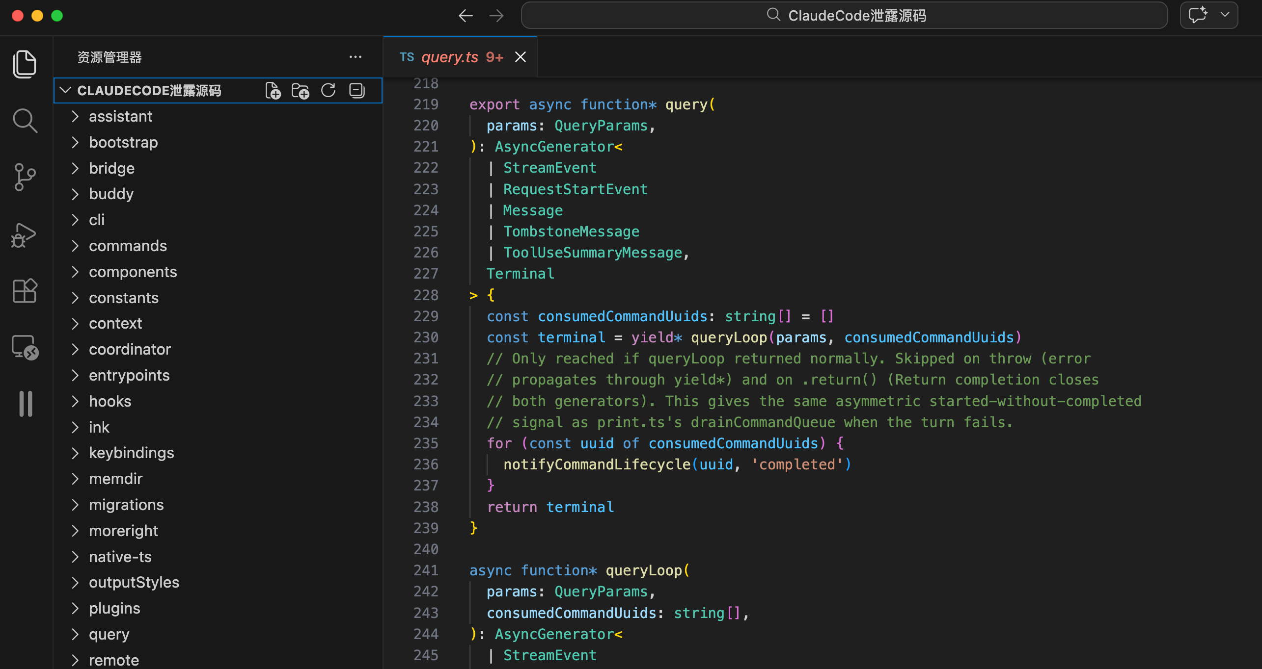 但我打开负责核心对话循环的 query.ts 文件一看,好家伙,最核心的代码其实就是一个 while(true) 无限循环!