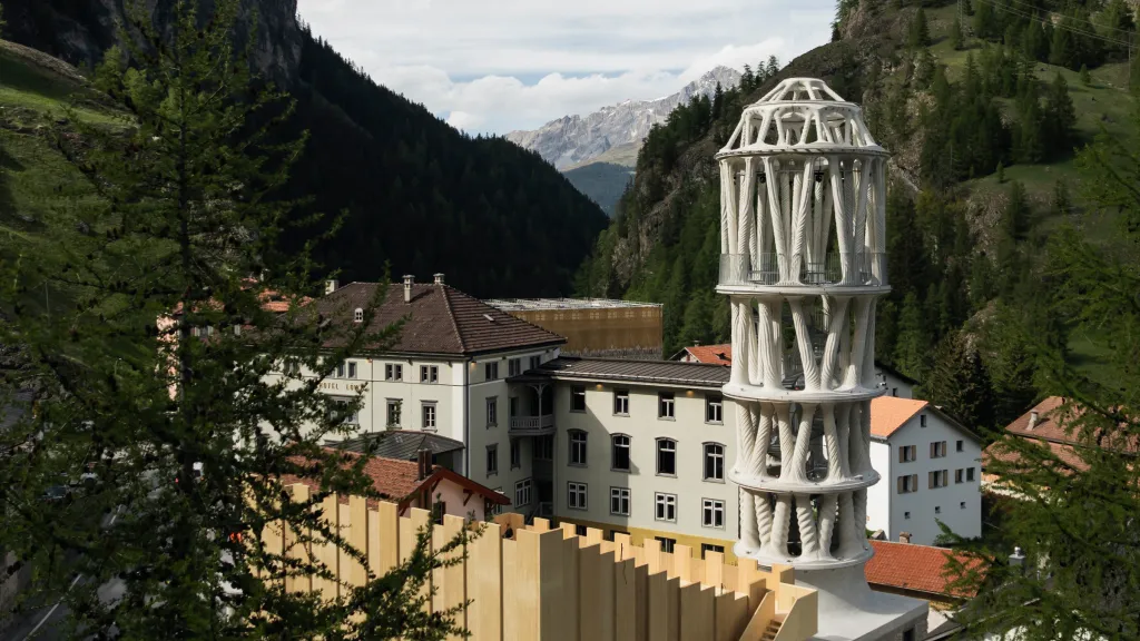 ETH Zurich 在瑞士 Mulegns 村建了一座 30 米高的白塔 Tor Alva。这是目前世界上最高的 3D 打印建筑,由 32 根混凝土柱组成,顶部有一个能坐 32 人的穹顶剧场。整座塔用了 124 个 3D 打印构件,堆叠了 2500 层混凝土,打印花了 900 小时。所有零件在工厂预制好,运到村里一天就能组装完。不用钢筋,靠巨型螺丝和钢缆连接。这个村子只有 11 个居民。塔的设计灵感来自当地糕点师做的分层蛋糕,5 年后可以拆下来搬到别的地方。碳排放比传统建筑少了 40%。