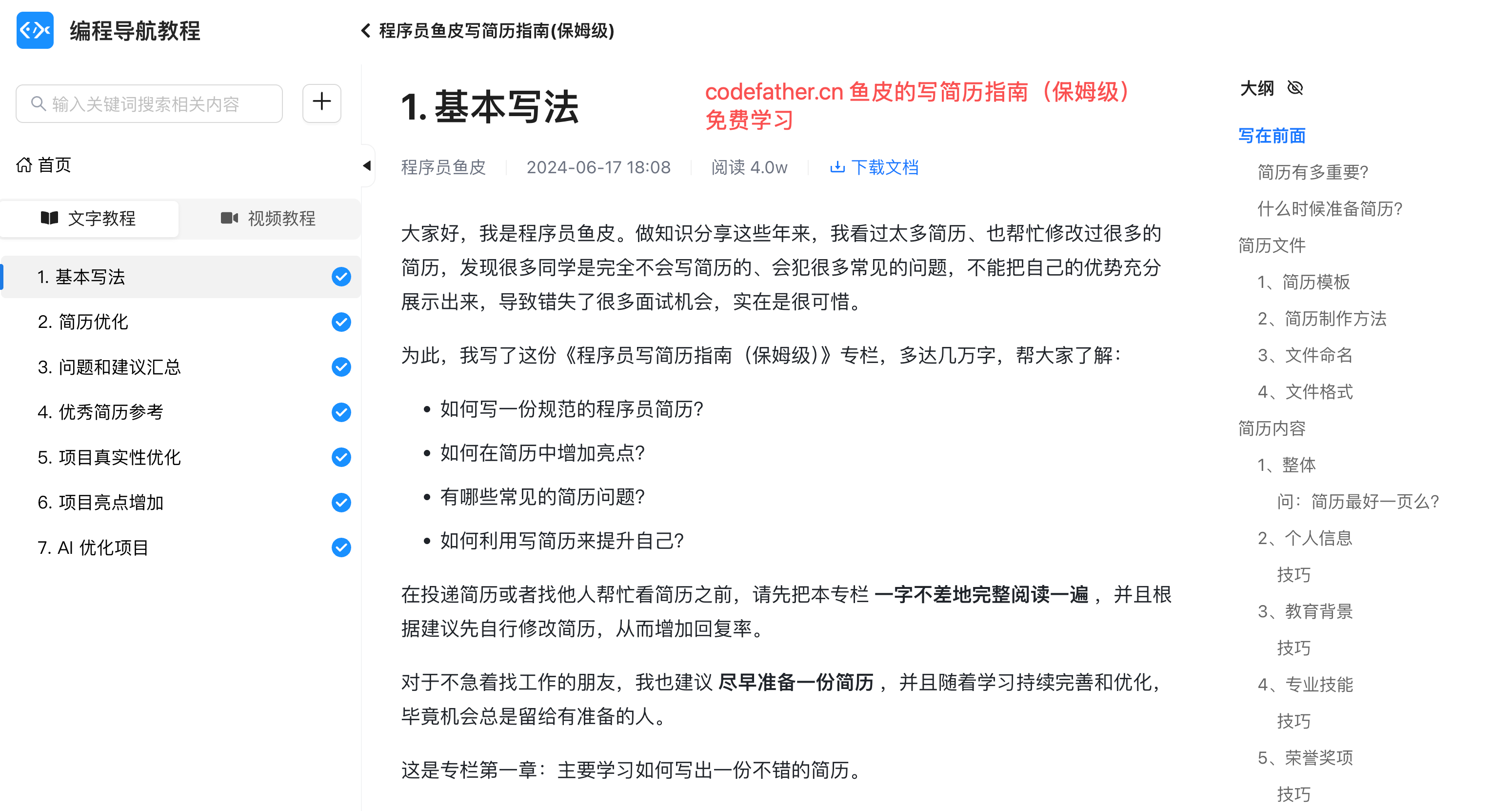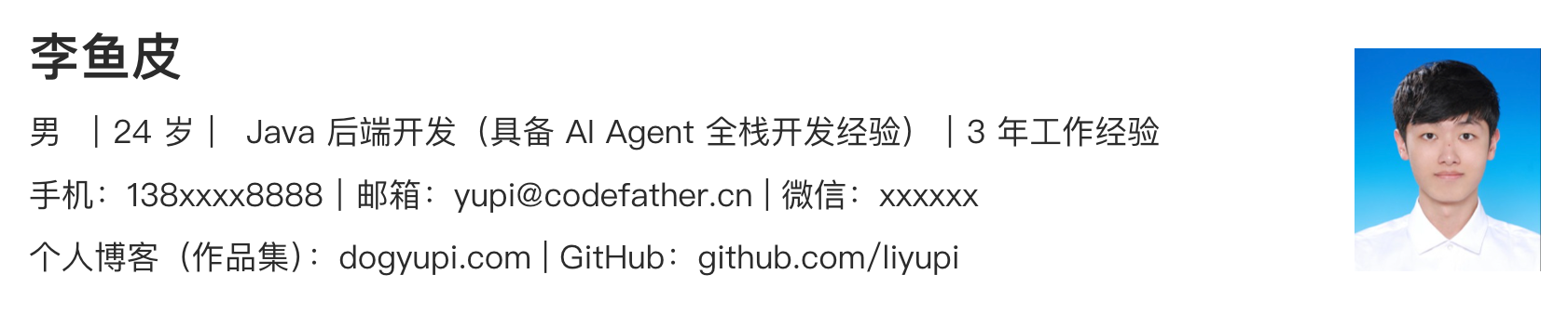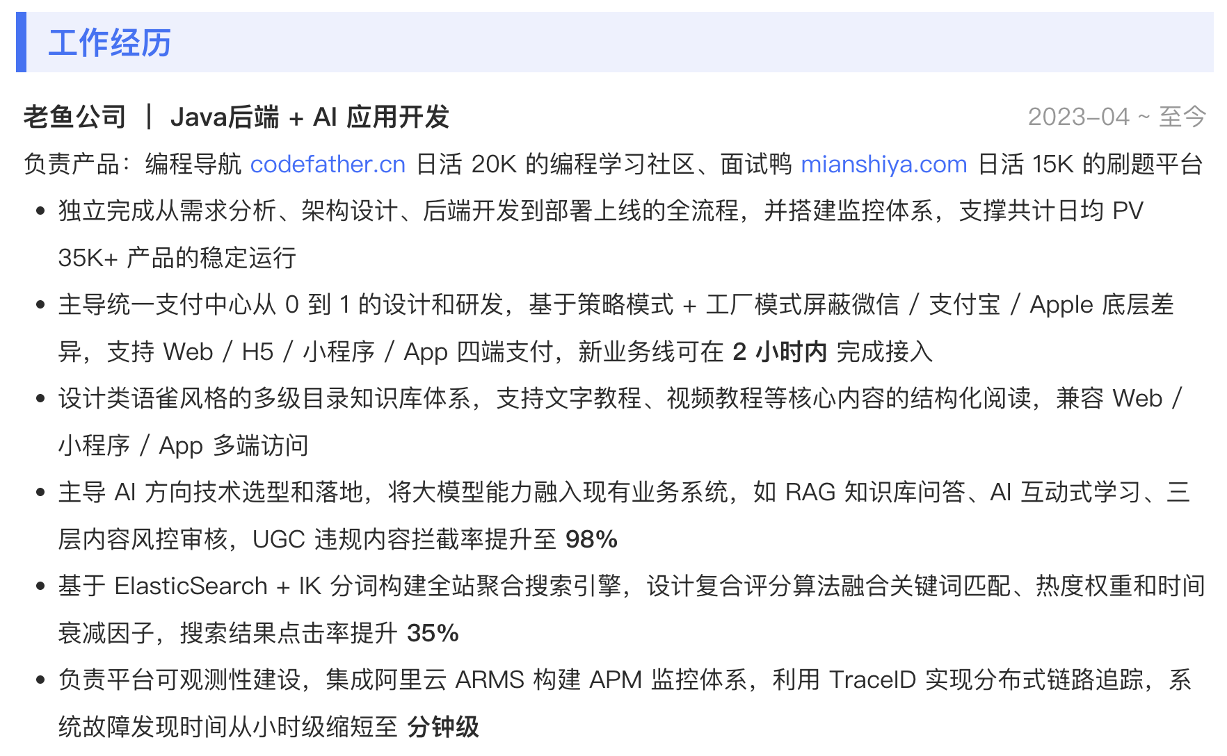 如果你想更系统地学习写简历的方法,可以看看我之前写的 《鱼皮的保姆级写简历指南》,几万字的内容,从模板选择到每个板块的写法都有详细讲解。