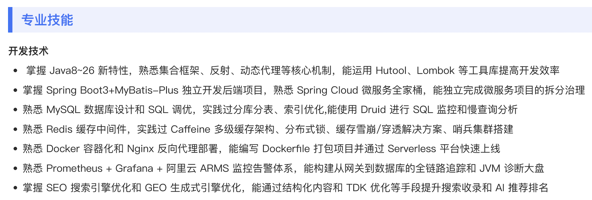 如果时间允许的话,你写的每一条技能、每一个项目,都应该对标企业的 JD 去写。比如招聘描述中写了 “要会 AI 应用开发的人”,你就要有 AI 相关的项目;需要会监控运维的人,你就要有可观测性建设的经验。