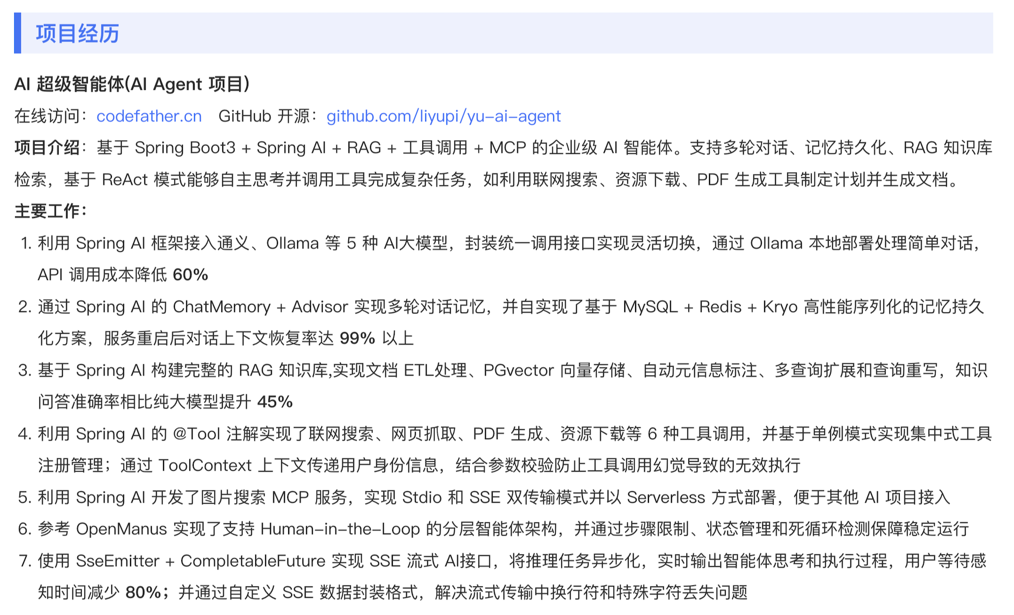 比如 “通过 ToolContext 上下文传递用户身份信息,结合参数校验防止工具调用幻觉导致的无效执行”,这一句话里包含了技术方案、解决的问题和效果,写得很具体,体现了真实性。但也不需要把实现代码都贴上去,那就有点儿过了,反而浪费简历空间。