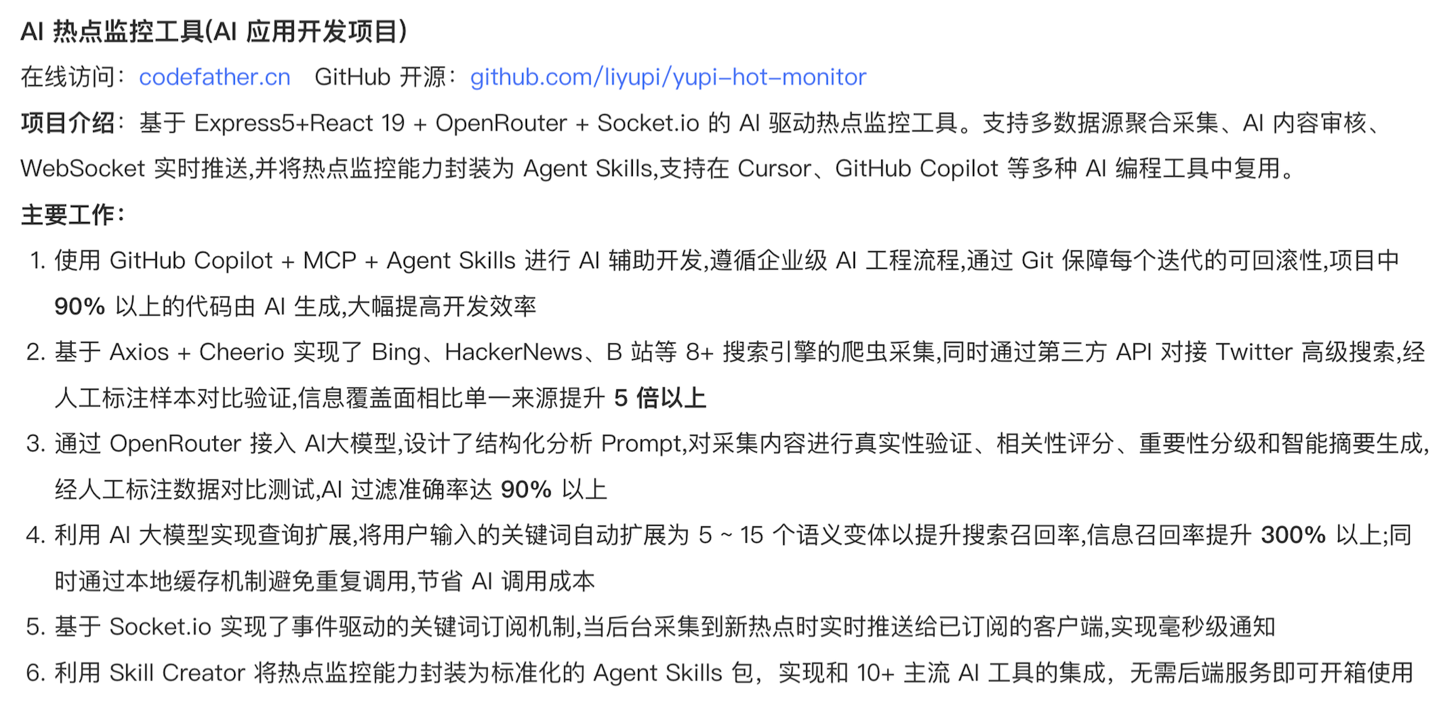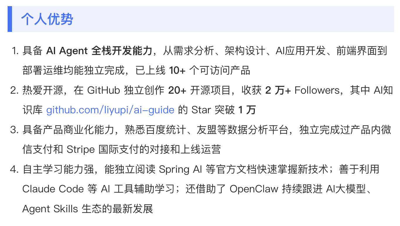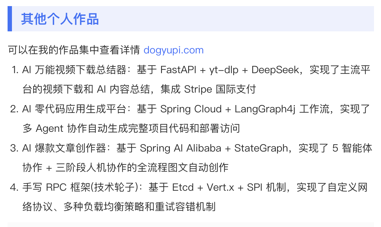 面试官扫一眼这个板块,就能感受到你的技术广度和主动性。而且你会发现这几个项目是互补的,有 AI 编程的、有微服务架构的、有多智能体协作的、还有技术轮子,每个项目的侧重点都不同。