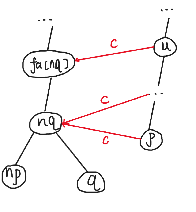 我们记 \(dep_x\) 表示节点 \(x\) 的深度,设第一个 \(go[][c]\) 指向 \(fa[nq]\) 的节点为 \(u\) ,\(u\) 其实就是 \(C\) 段中的第一个等价类。那么单次加的时间复杂度就是 \(p\) 到 \(u\) 中的节点个数,这个个数记为 \(k\) 。