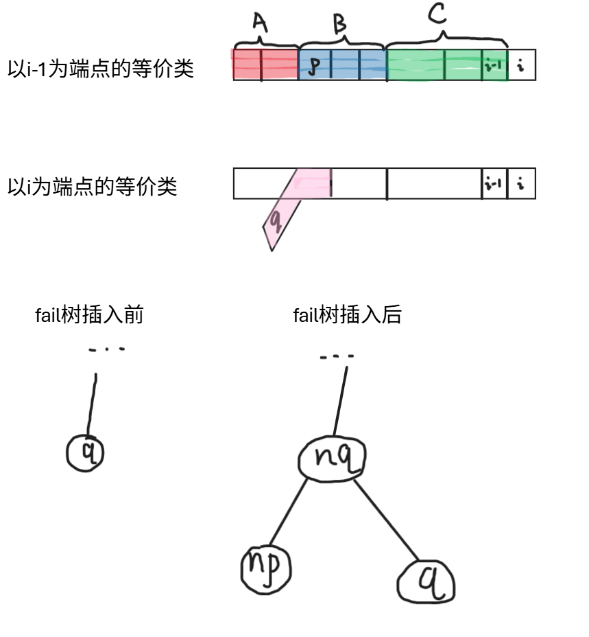 \(len[p]+1<len[q]\)。首先 \(len[p]+1>len[q]\) 肯定是不成立的,否则这样的连边都是错误的。此时 \(q\) 等价类长度 \(>len[p]+1\) 的部分一定与当前的 \(np\) 等价类的对应部分不同,所以是不满足 \(f[np]=q\)。我们需要新建一个等价类 \(nq\),令它对应 \(len[nq]=len[p]+1\) 的部分,\([len[p]+2,len[q]]\) 作为新的 \(q\) ,有 \(np,q\) 都是新等价类的儿子。其中新等价类的信息可以从 \(q\) 继承,\(B\) 段连向 \(q\) 的边要改成连向新等价类的。