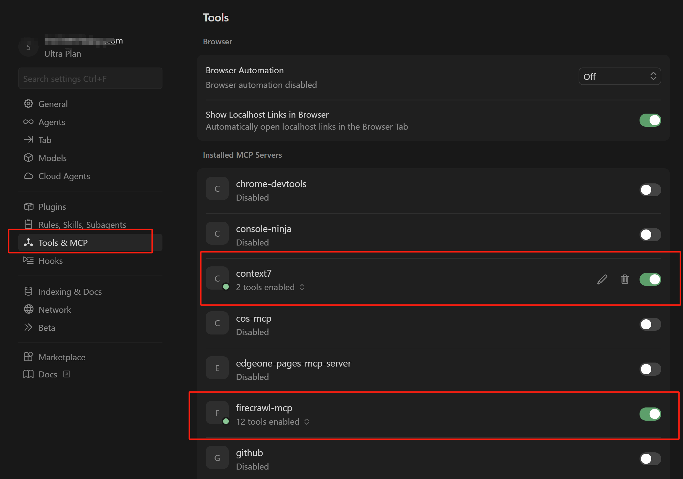 首先是 给 AI 装上联网能力。我配置了 Firecrawl MCP 让 AI 能抓取网页内容,又配置了 Context7 MCP 让 AI 能获取最新的技术文档。