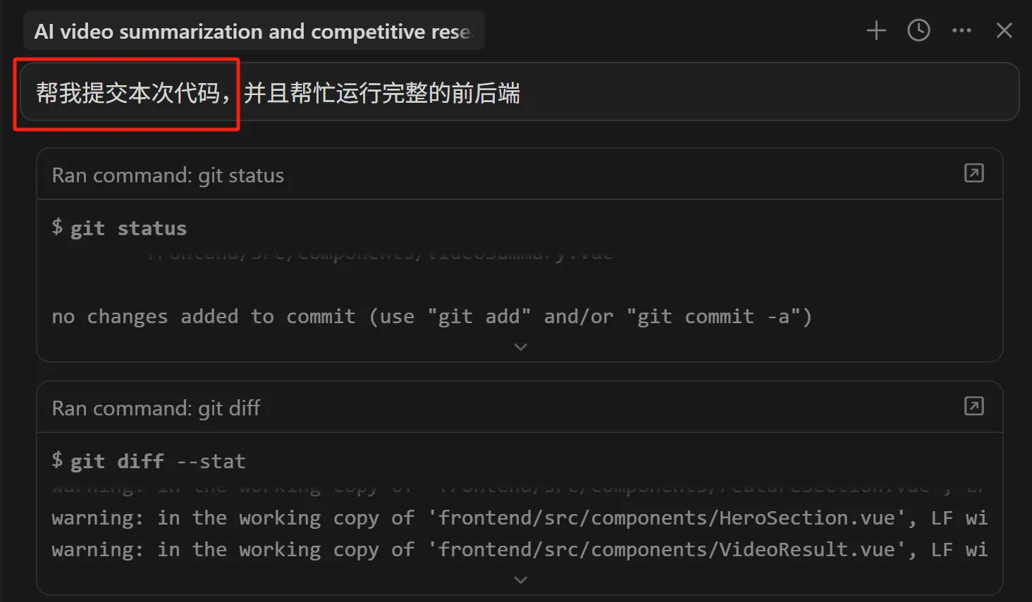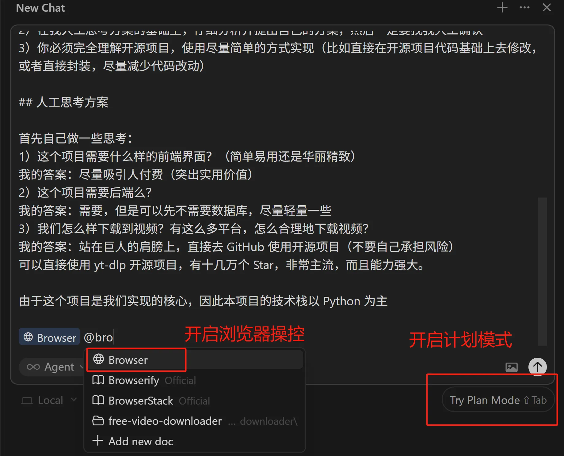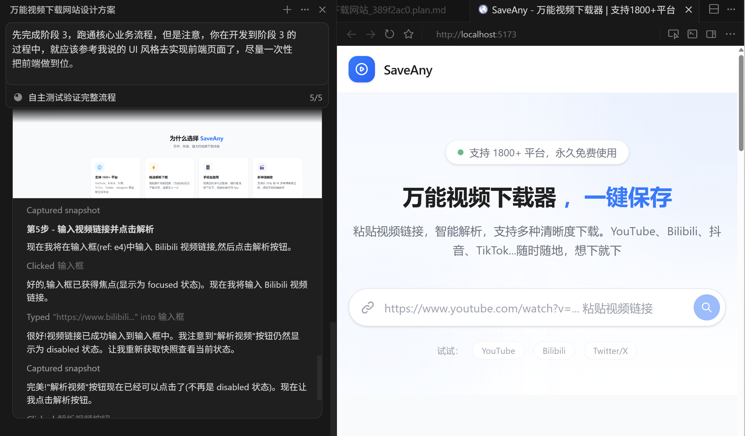在这个项目里,AI 通过 Cursor 内置的 Browser Use 功能,自己启动浏览器、输入视频链接、点击解析按钮,然后检查结果是否正常显示,比人工测试方便太多了。