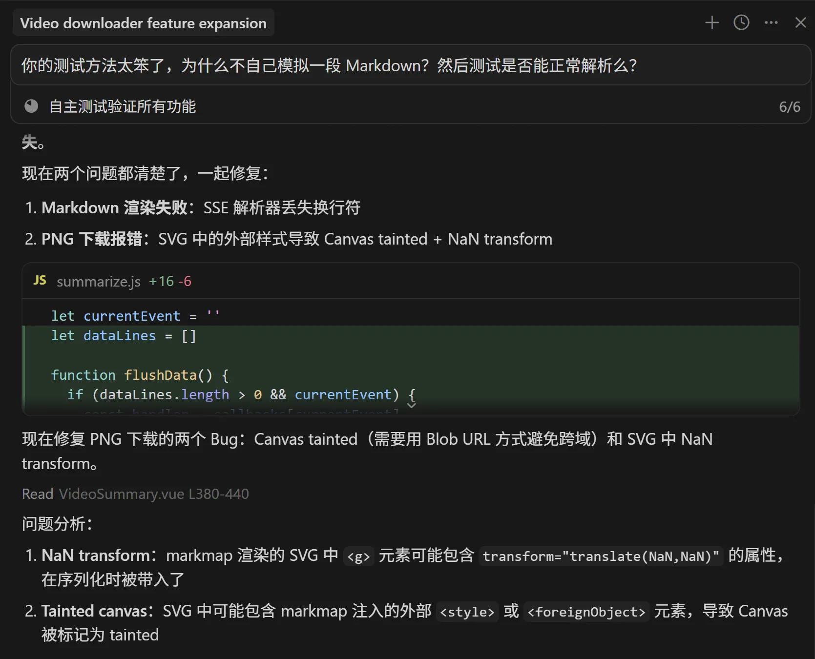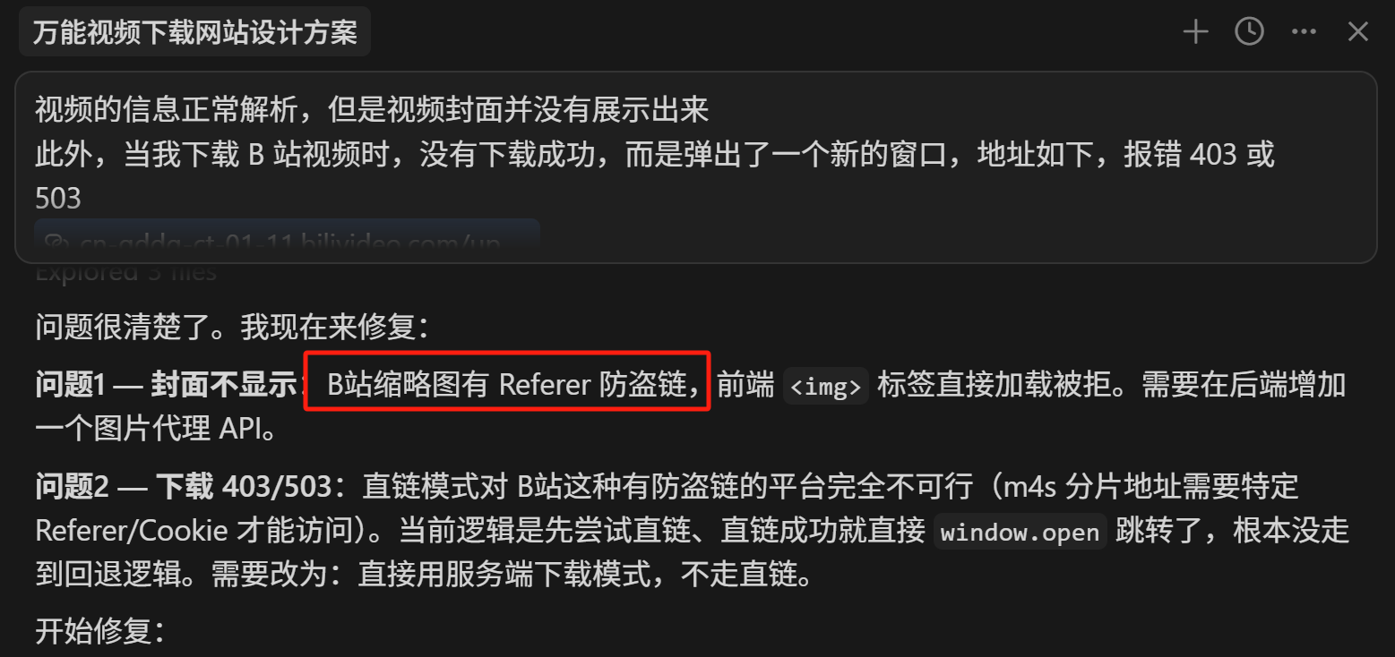 比如我通过人工测试发现 B 站视频下载报了 403 错误,就把报错信息直接贴给 AI,让它自主分析和修复。AI 很快发现是防盗链的问题,然后自己搞定了。