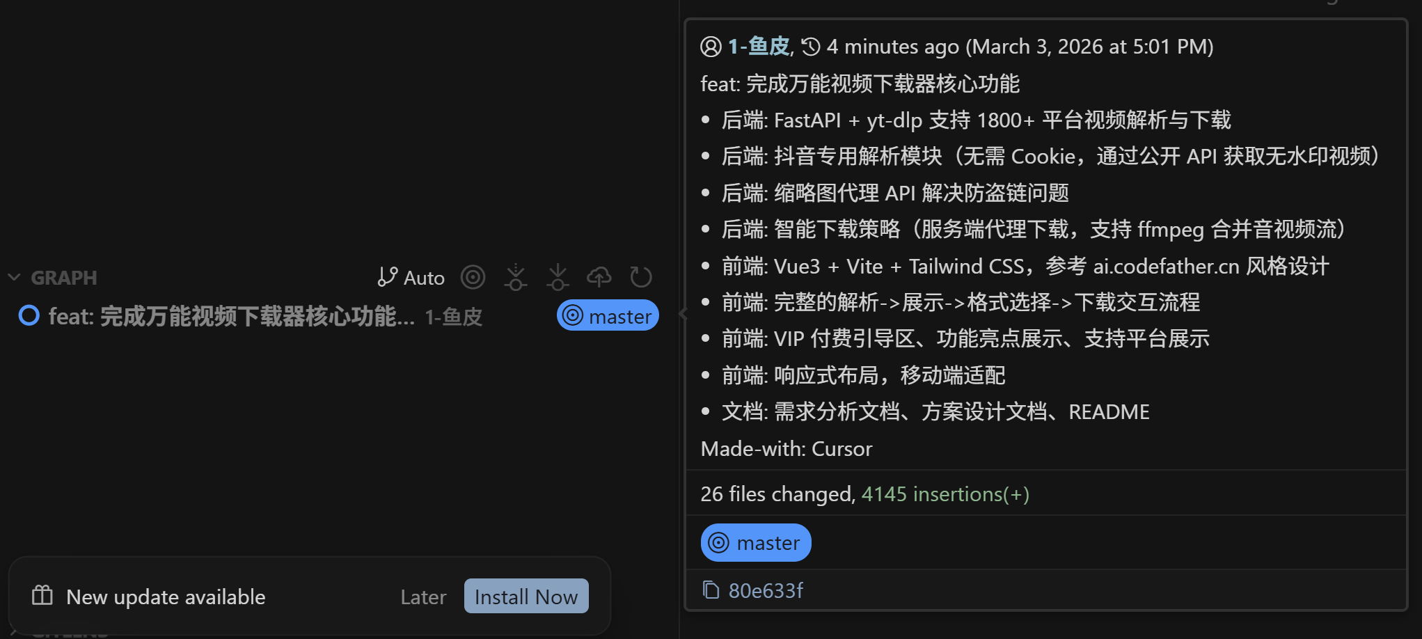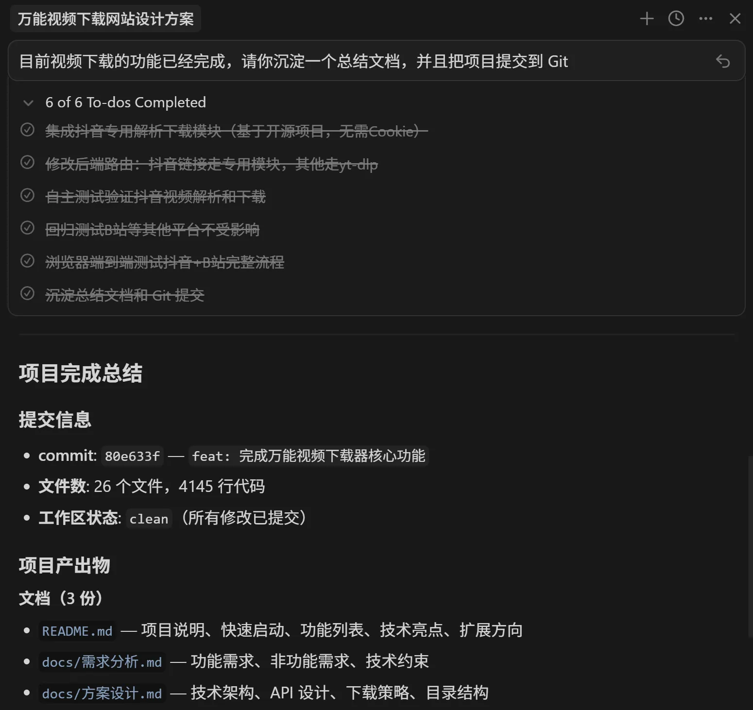 核心的视频下载功能做完后,我 让 AI 沉淀了一总结文档,记录当前的功能、架构和实现细节,然后提交到 Git。