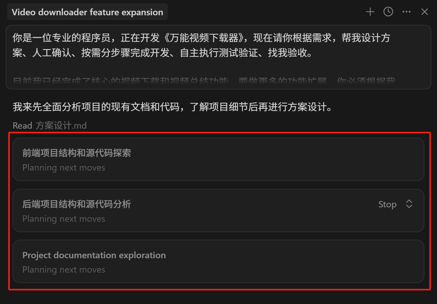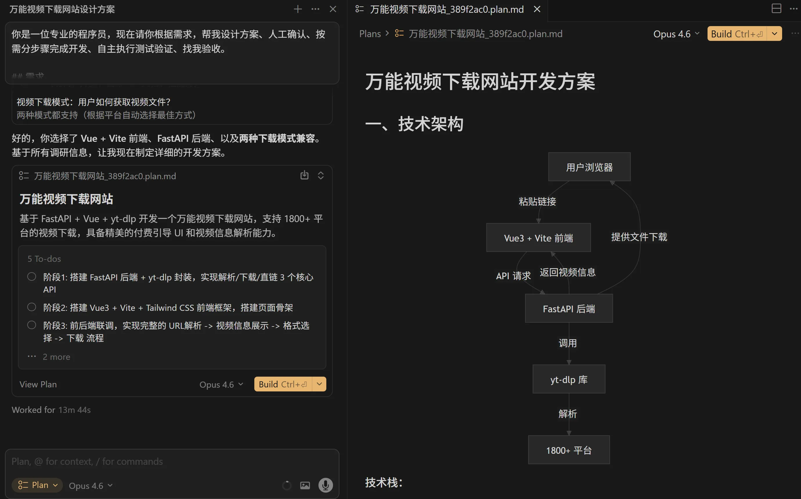 AI 生成了一个技术方案文档,我仔细看了一遍,发现它把一些后续才做的功能也纳入计划了,于是我就跟它说「先完成核心的视频下载功能」,一步步来。
