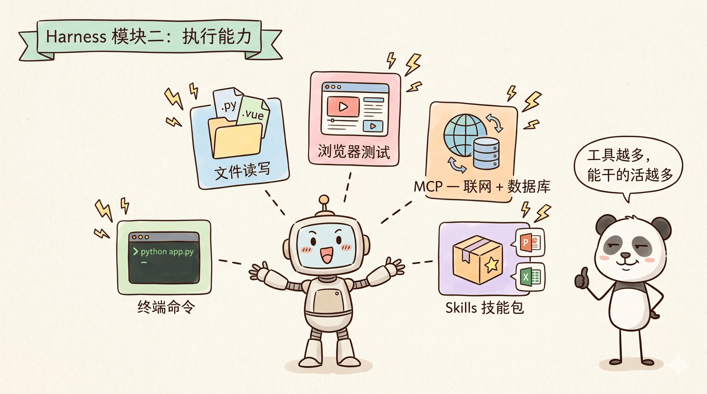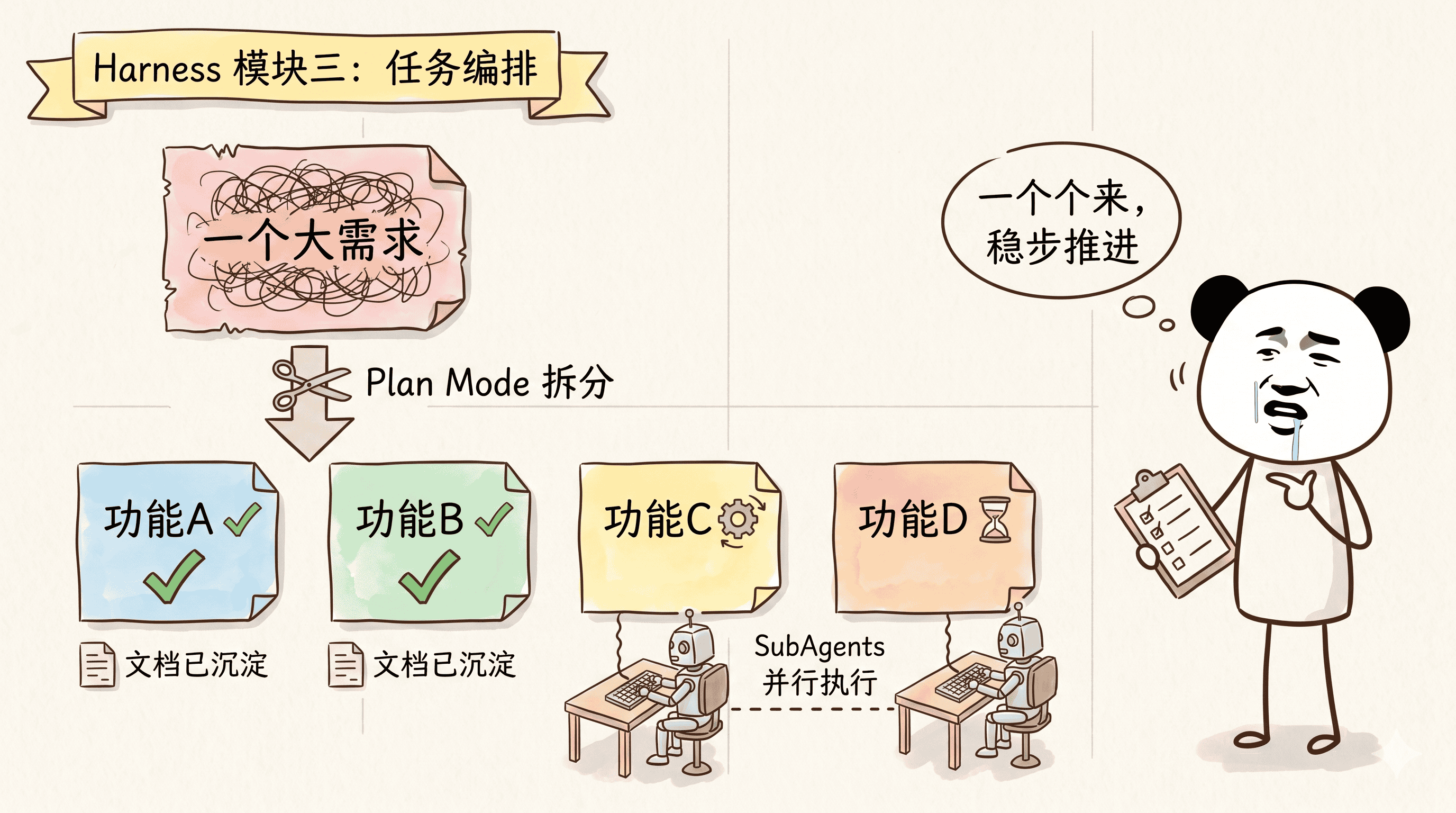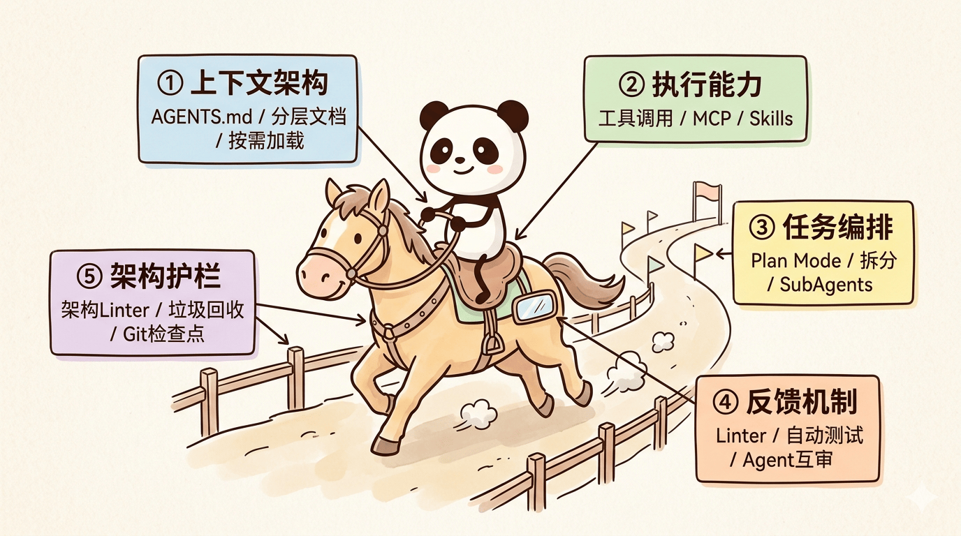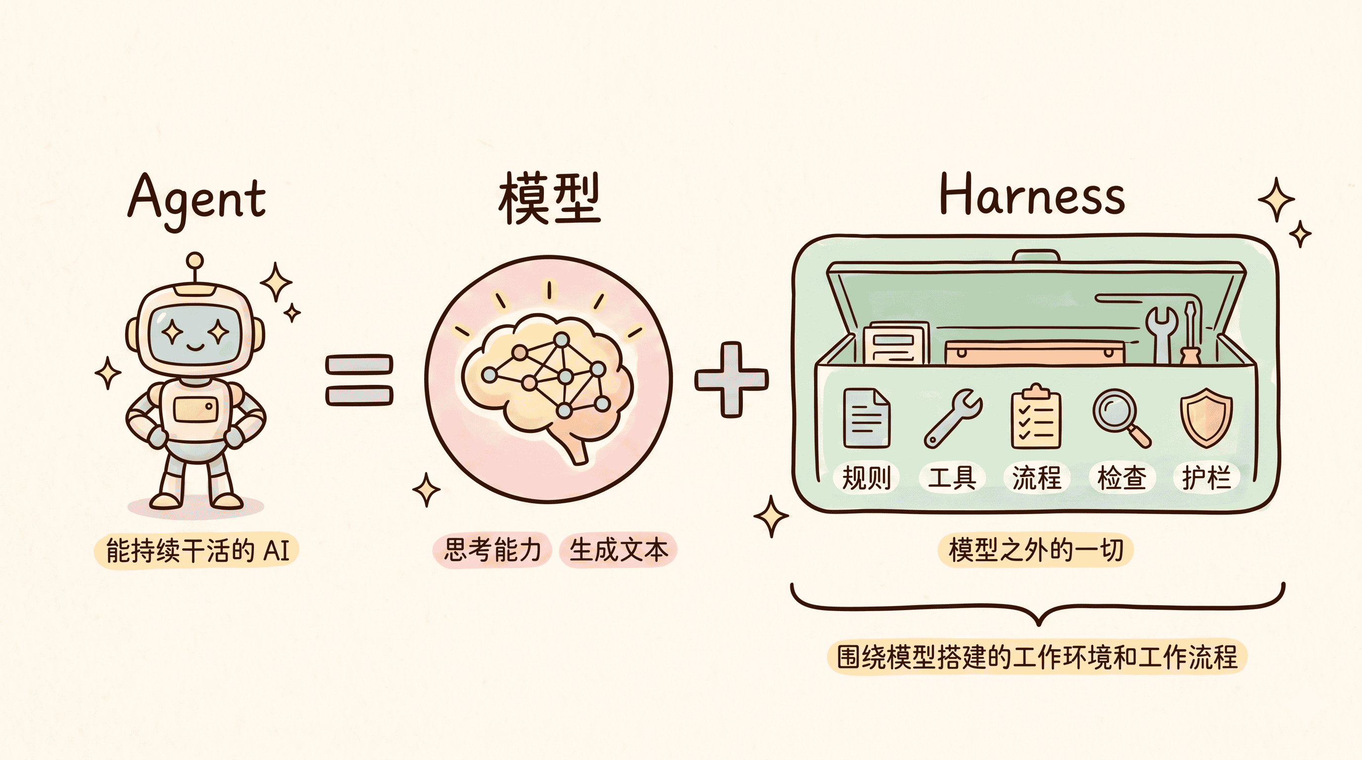 - Harness 把它们全部包在里面,关注的是「怎么让 AI 持续靠谱地干完一整件事」