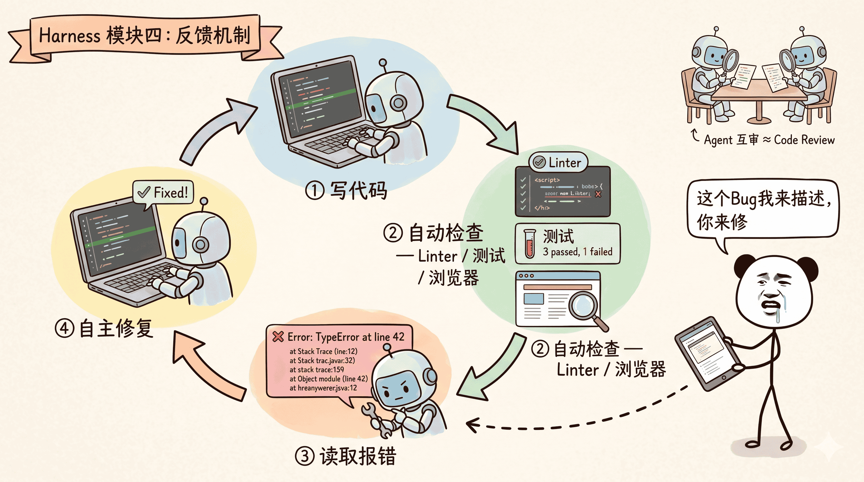 这些都是 反馈机制 的体现,给 AI 提供反馈信号让它自我修复,AI 搞不定的时候人工介入纠偏。