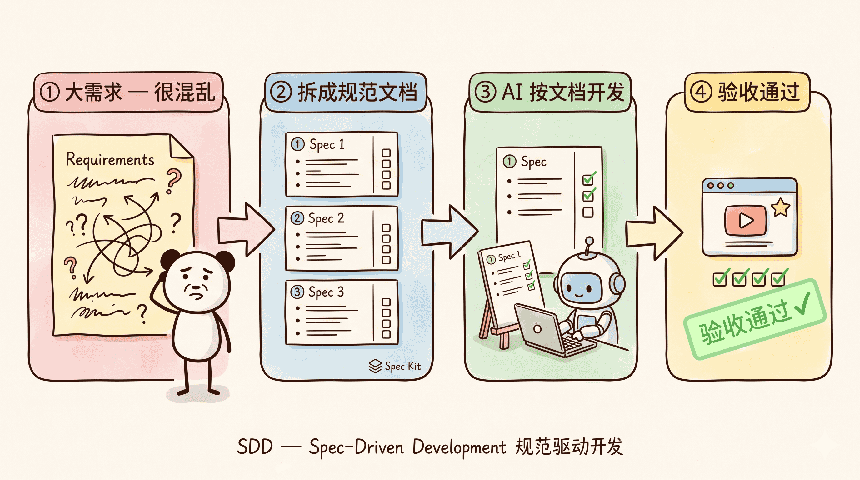比如 Spec Kit 工具使用的是 SDD(Spec-Driven Development)规范驱动开发的思路,它会先引导你把需求拆解成详细的规范文档,然后让 AI 按照文档一步步开发,每个阶段都有明确的验收标准。