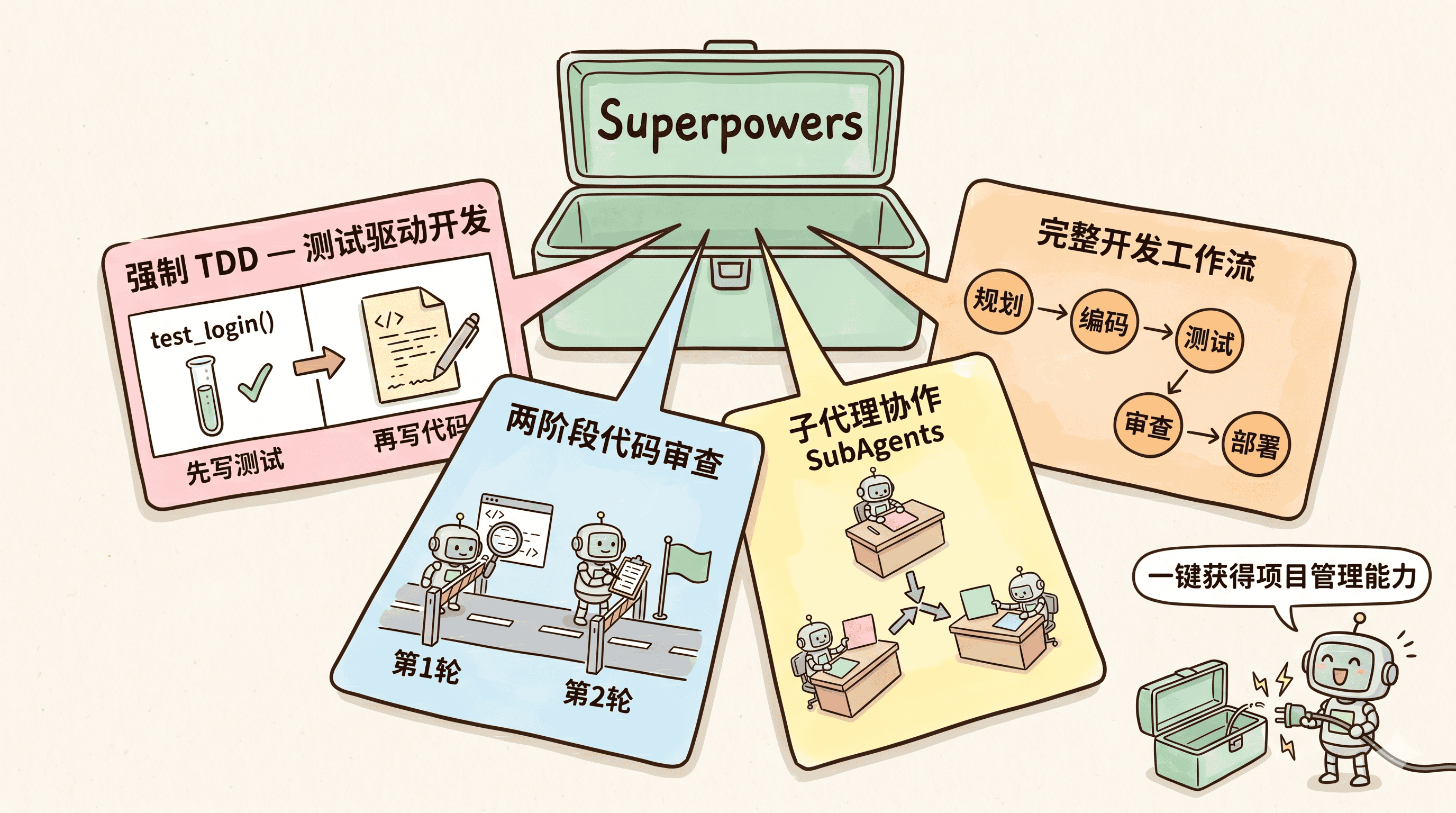 还有 Superpowers 这种 Agent Skills 框架,它内置了一整套开发工作流,包括强制 TDD(Test-Driven Development)测试驱动开发,就是先写测试再写代码,还有两阶段代码审查、子代理协作等,相当于直接给 AI 装了一套完整的项目管理流程。