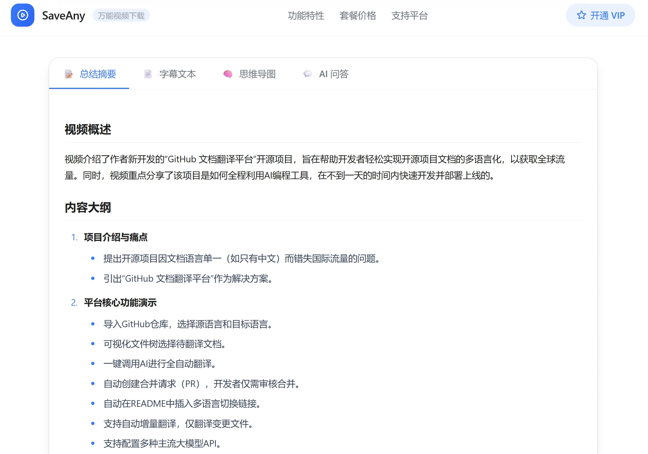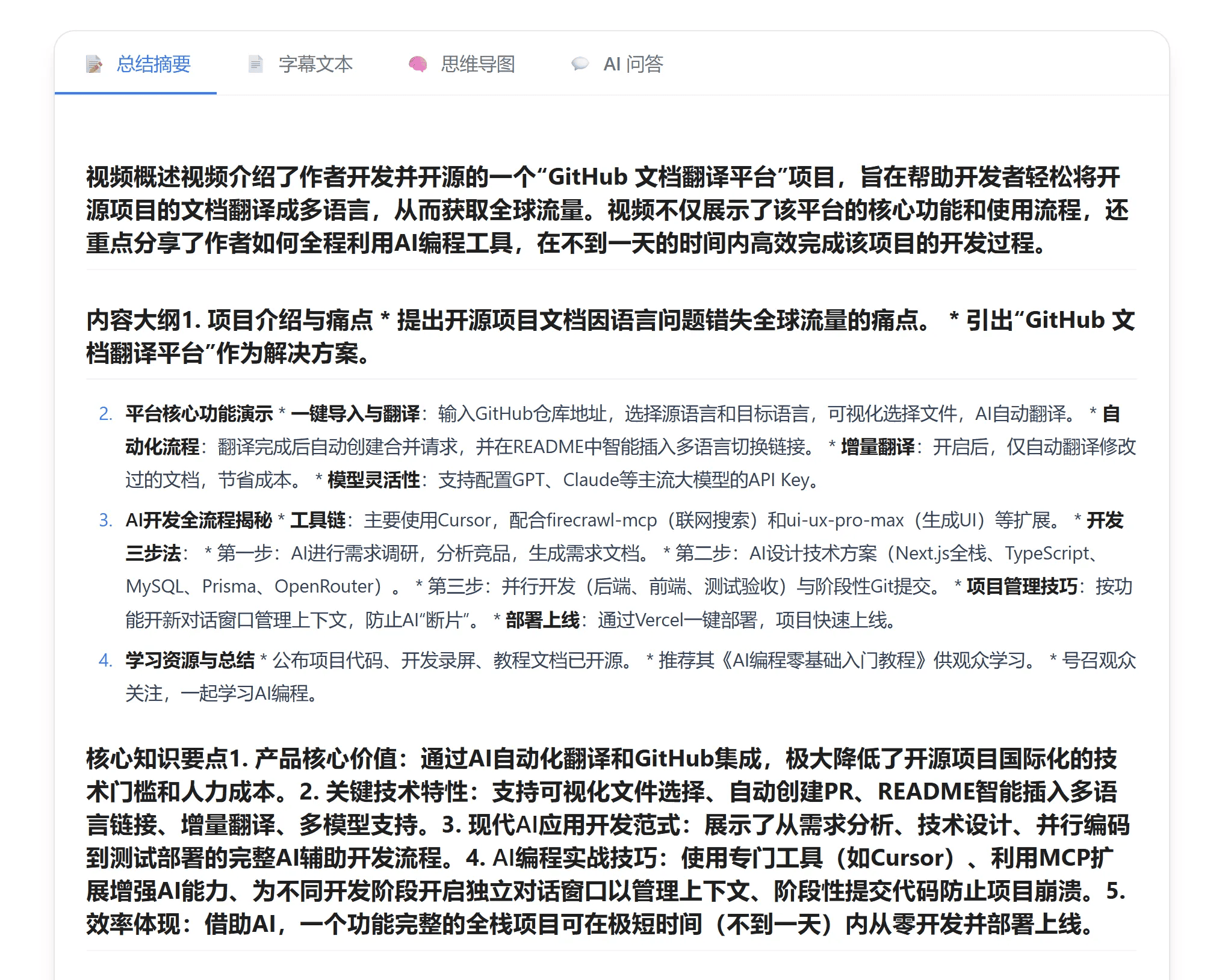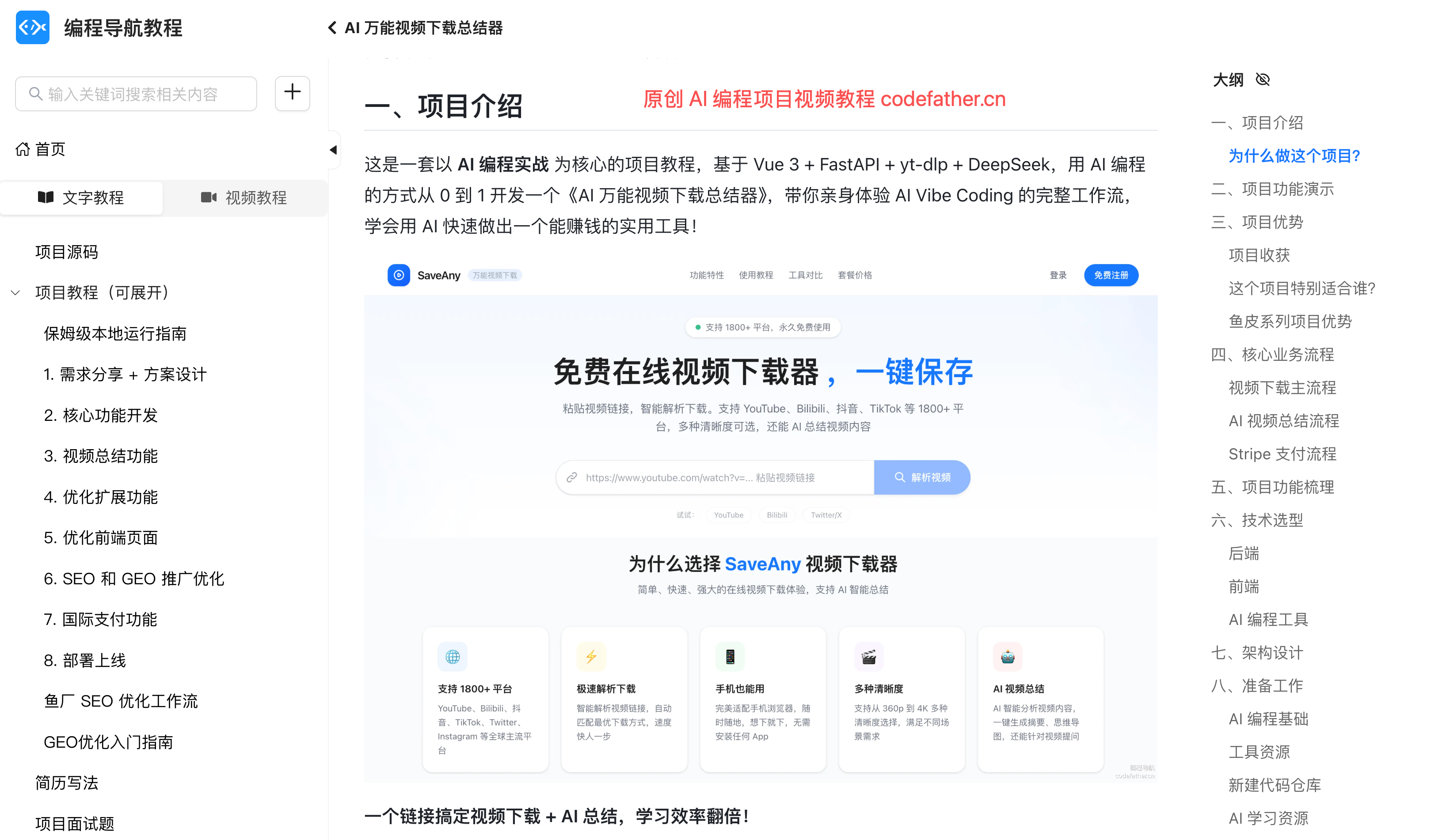 这个项目是我在 编程导航 全程直播带做的 AI 编程全栈项目「万能视频下载总结器」。我用 AI 从零开发了一个能从各大平台下载视频、并用 AI 总结视频内容的网站,还做了 SEO / GEO 优化和 Stripe 国际支付。