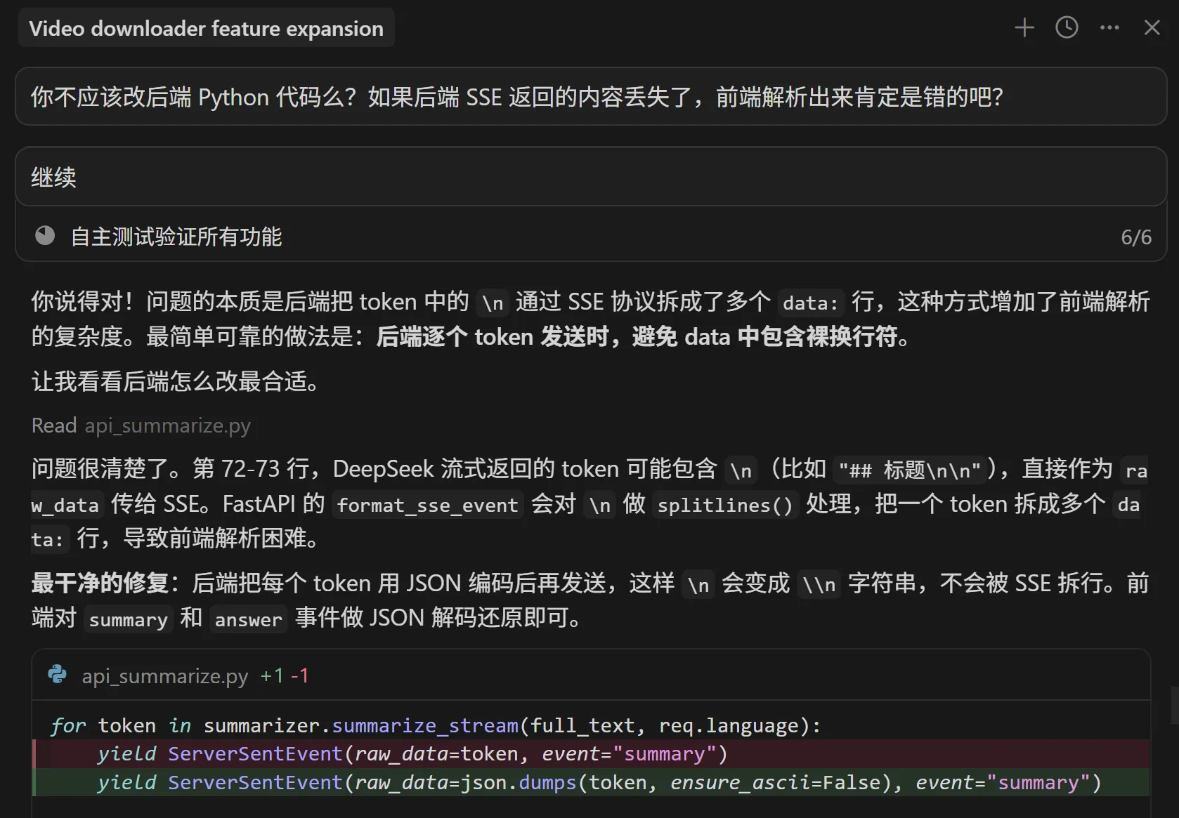 后来我换了个角度去描述这个问题,跟它说:你不应该改后端 Python 代码么?如果后端 SSE 返回的内容丢失了,前端解析出来肯定是错的吧?