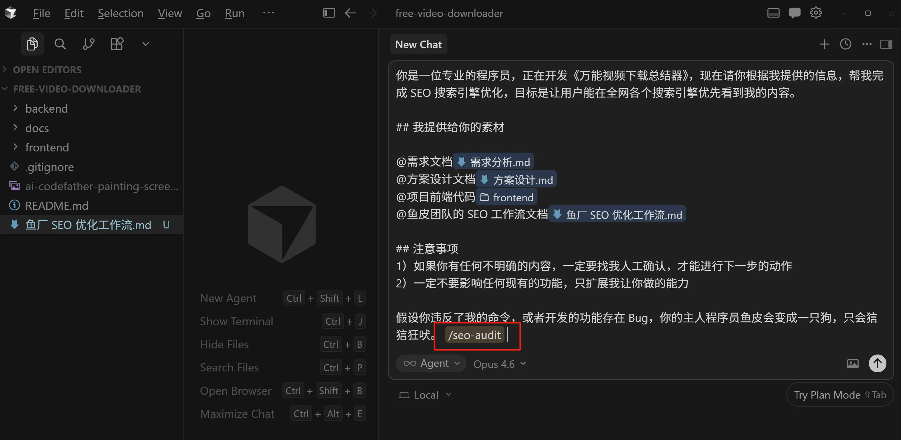 后来给项目做 SEO 优化的时候,我还用了一个 SEO Audit 技能,让 AI 自动分析网站并生成优化方案。