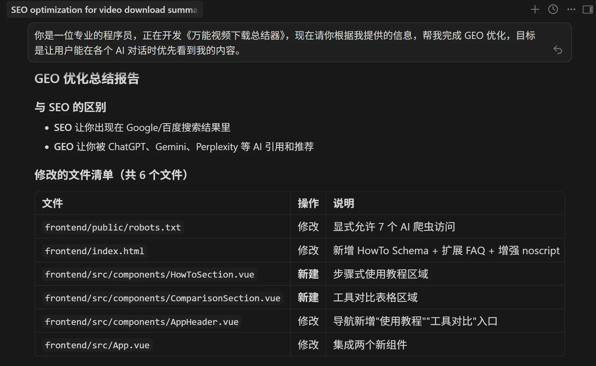 做完 SEO 之后,还要做 GEO 优化,我直接复用了 SEO 的对话上下文,这样 AI 已经了解了项目背景和代码,不用重新再读一遍,省了不少时间。