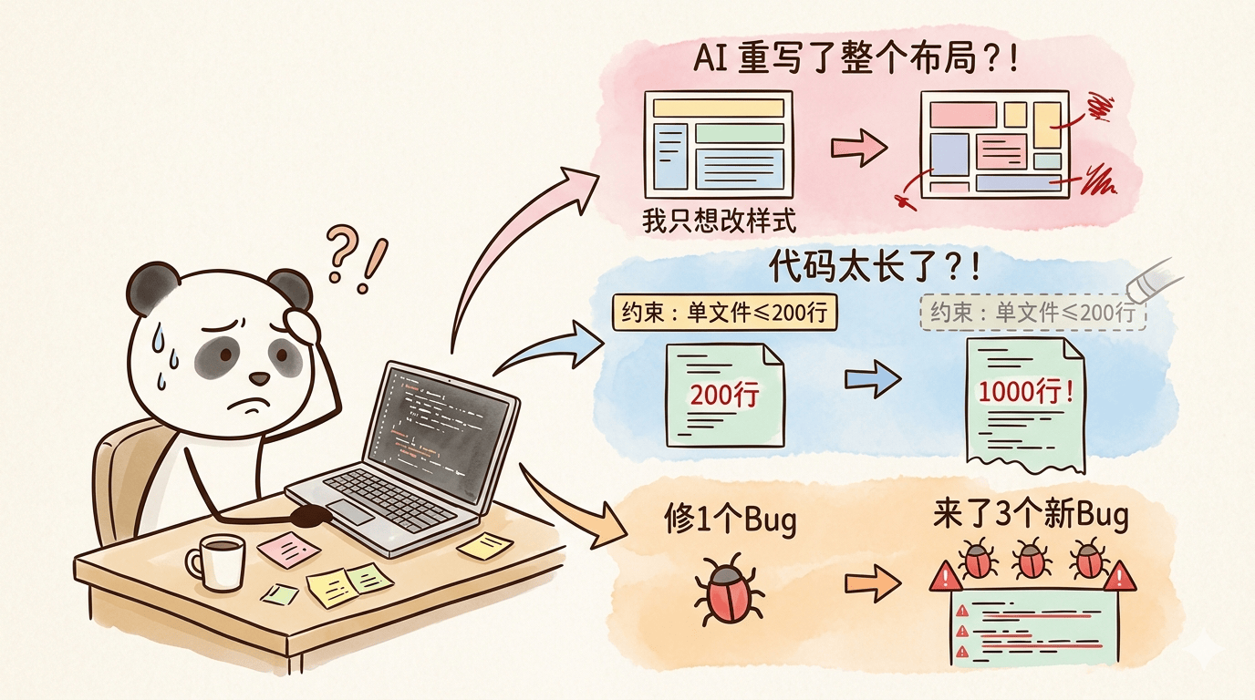 - 还有更头疼的,你让 AI 修一个项目里的 Bug,结果又出了 3 个新 Bug,项目都跑不起来了,代码越改越乱。