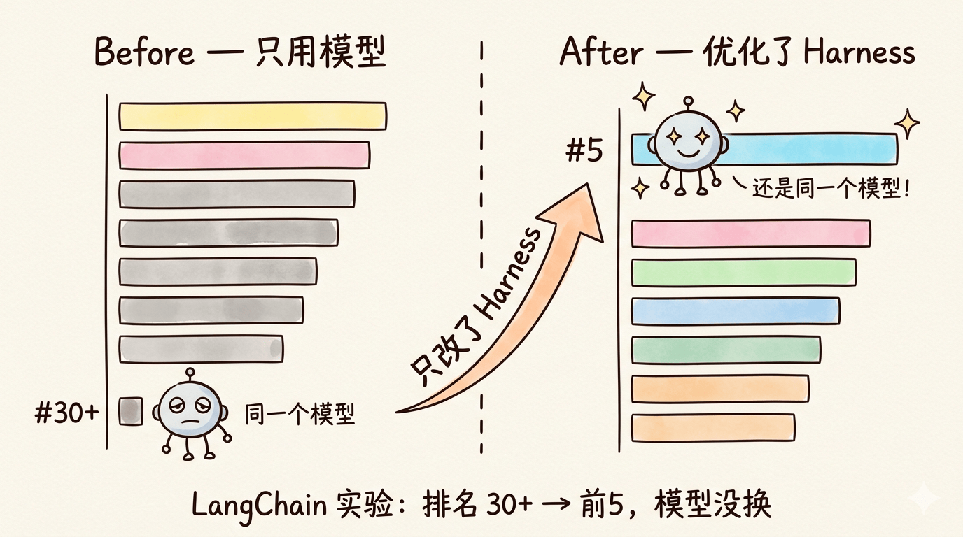 知名的 AI 框架 LangChain 做了个实验,使用同一个 AI 模型,只优化围绕模型搭建的 Harness 部分,编码基准测试的排名直接从 30 名开外冲到了前 5!