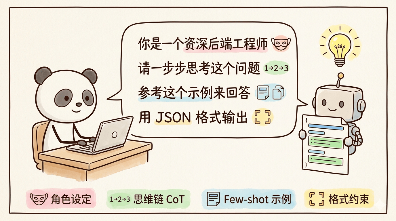 我们学着给 AI 设定角色、约束输出格式、用思维链让它一步步思考、给几个示例让它模仿。这些技巧虽然简单,但确实能让 AI 的输出质量提升一大截。