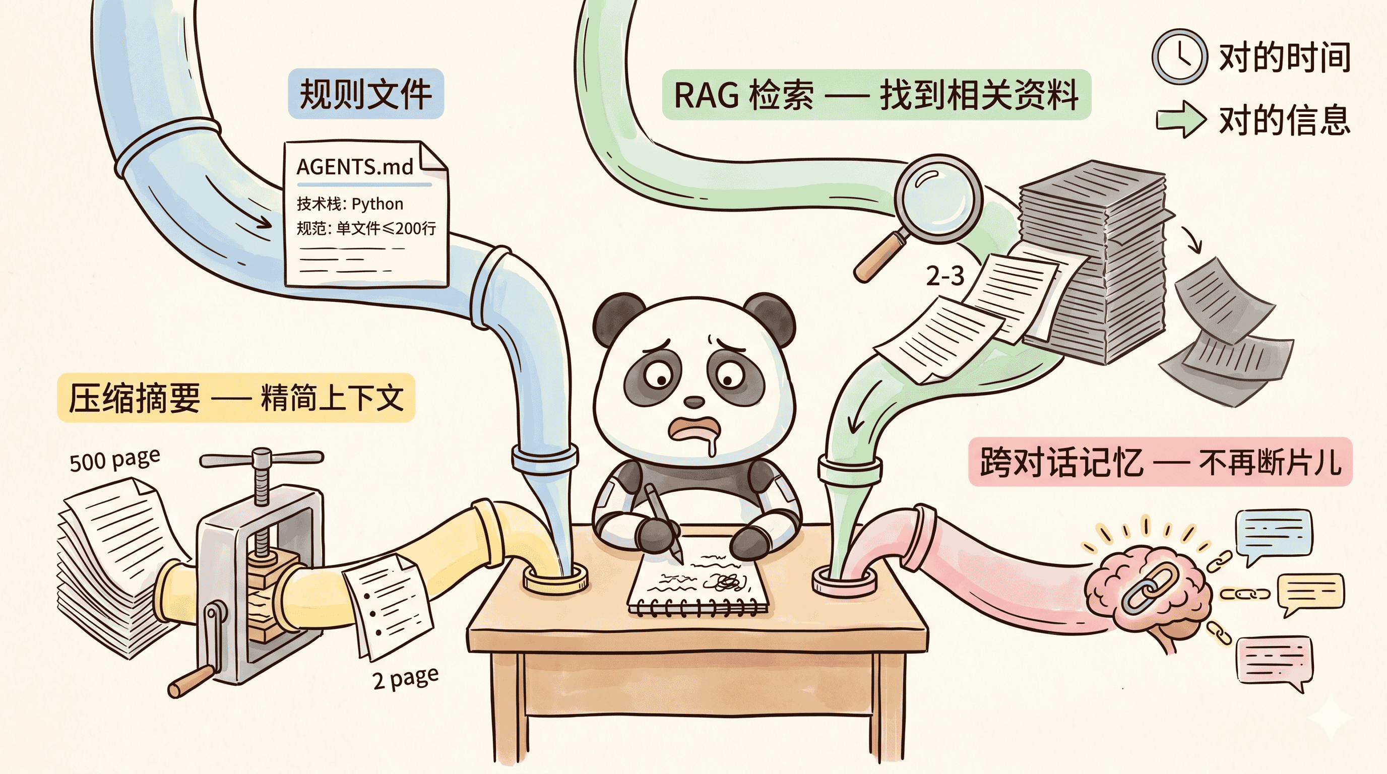 比如写 AGENTS.md 规则文件让 AI 了解项目背景,用 RAG 让 AI 能检索到相关资料,对过长的上下文做压缩和摘要,甚至给 AI 建立跨对话的记忆机制,让它不会聊着聊着就断片儿。