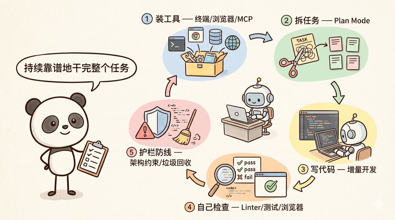 在上下文工程的基础上又往前走了一步。除了关注给 AI 提供什么信息,还要关注给它配什么工具、大任务怎么拆分成小步骤分批完成、出了问题怎么自己检查和修复、怎么防止代码质量随着迭代慢慢下滑。让 AI 不只是回答问题,而是 持续靠谱地完成整个任务。