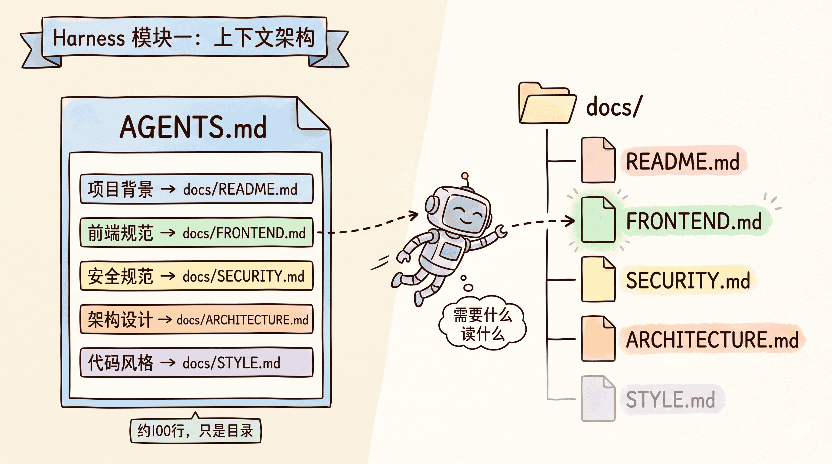 不过要注意,AI 能处理的上下文空间是有限的。OpenAI 团队就踩过一个坑,他们试过把几千行的规则塞进一个大文件,结果 AI 反而更容易忽略里面的关键信息。后来他们改成把 AGENTS.md 当成一个 目录 来用,只写大概 100 行的摘要和索引,然后在 docs/ 目录下放详细的设计文档。AGENTS.md 里面写清楚「前端规范看 docs/FRONTEND.md、安全相关看 docs/SECURITY.md」这样的指引,AI 需要什么就去读对应的文件。这种 按需加载 的思路,就是上下文架构的核心。