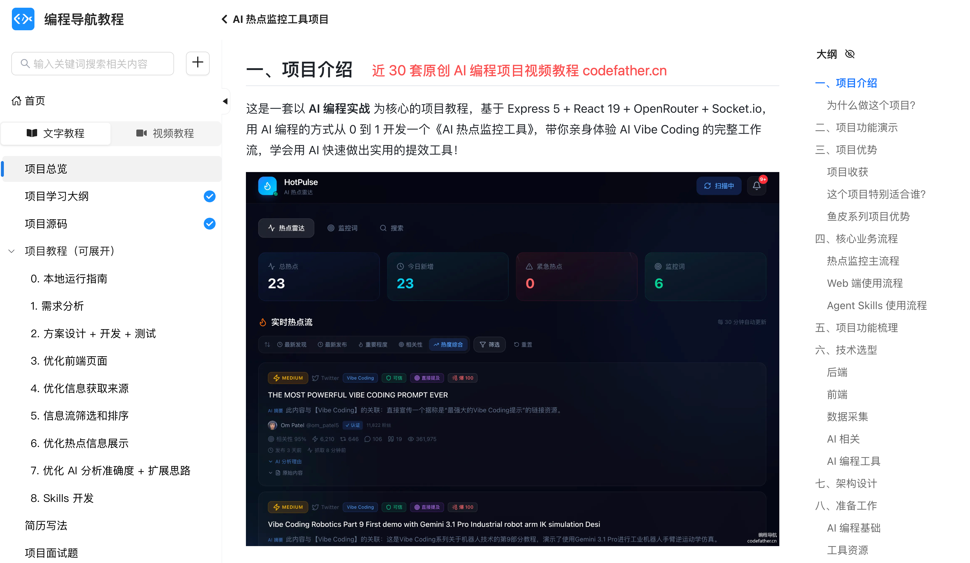 我在 编程导航 带大家做过几套 AI 编程全栈项目,除了上面提到的万能视频下载总结器,还有 AI 热点监控工具、GitHub 文档翻译器、AI 闯关学习小程序等,其实都是 Harness Engineering 的完整实战。每个项目都是从需求分析开始,到方案设计、AI 编码开发、测试验证、功能扩展,走完一整套流程。如果你想跟着实战项目边做边学 AI 编程和 Harness,可以来看看。